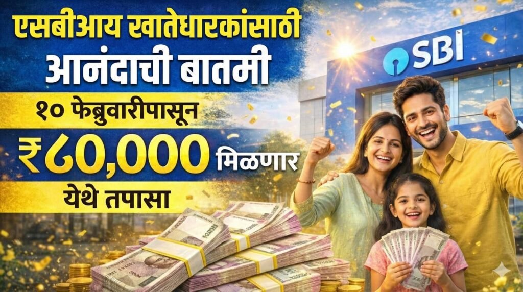 SBI Account Holders Good News : स्टेट बँक ऑफ इंडिया (SBI) मध्ये खाते असलेल्या कोट्यवधी ग्राहकांसाठी एक मोठी आणि दिलासादायक बातमी समोर आली आहे. उपलब्ध माहितीनुसार, 10 फेब्रुवारीपासून एसबीआय खाताधारकांना ₹80,000 पर्यंतची रक्कम मिळण्याची प्रक्रिया सुरू होणार आहे. ही बातमी समजताच बँक ग्राहकांमध्ये उत्सुकता वाढली असून, ही रक्कम कोणाला मिळणार आणि कशी तपासायची याबाबत सर्वांनाच जाणून घ्यायचे आहे.